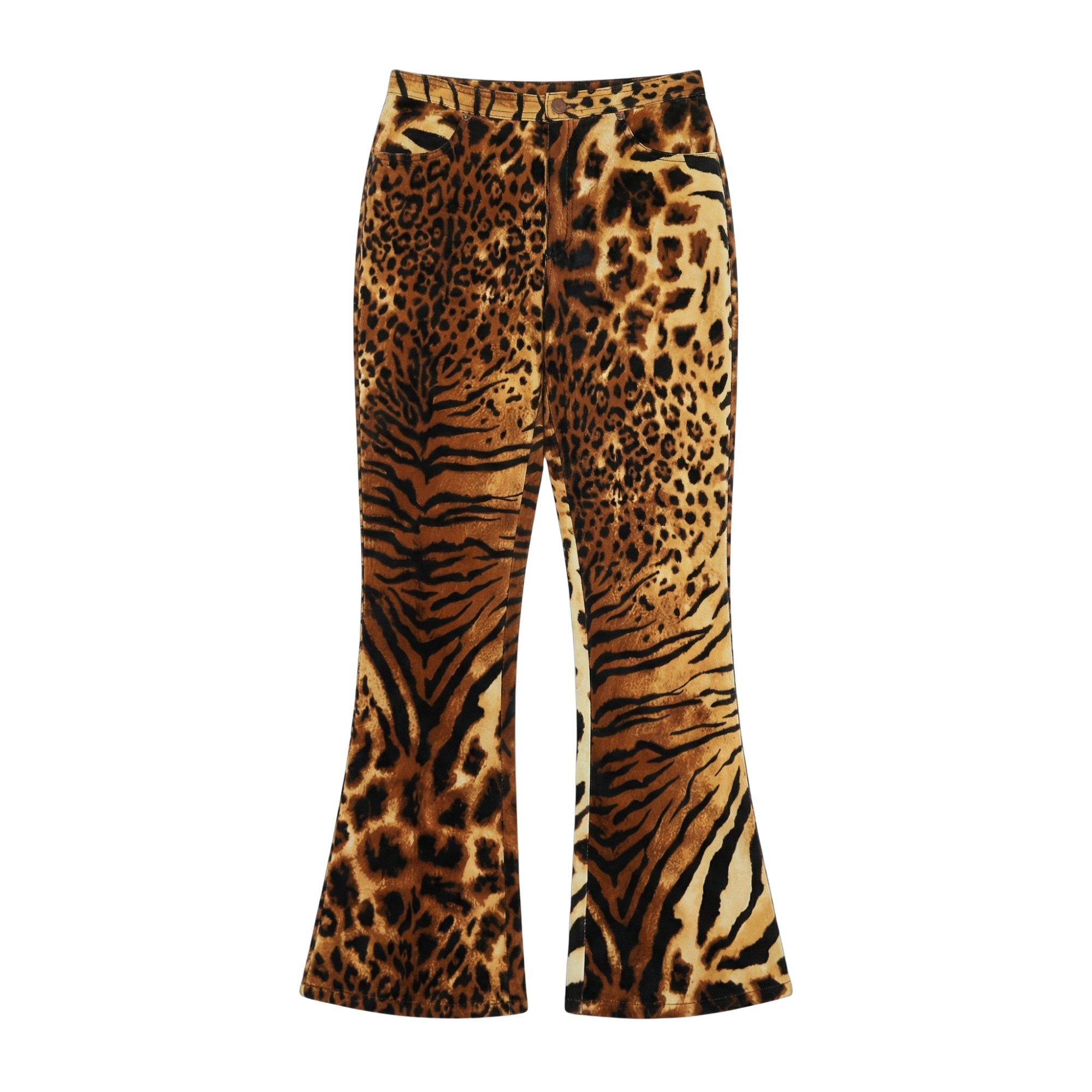 • 1990s Kenzo Jeans • Stretch-cotton • Leopard and tiger print • Bronze logo button and rivets • High-waist • Kick-flare leg