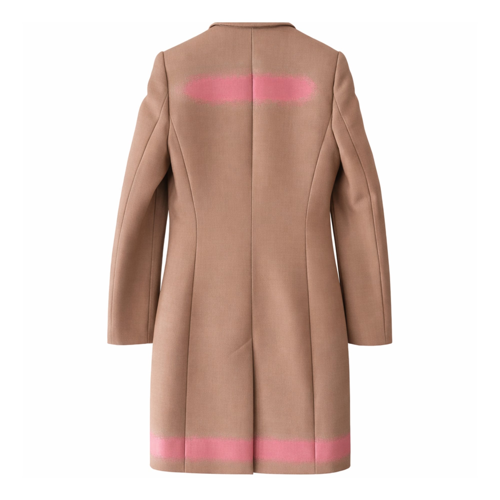 Expertly tailored from a stiff, sculpting wool with a hint of silk, the fabric has a sumptuous coffee-beige tone and a substantial, almost armour-like handle. The silhouette is curved and cocooning, recalling Balenciaga’s historic volumes, while a sharply nipped waist and exaggerated hips sculpt the body with dramatic precision. Oversized fabric-covered buttons heighten the cartoonish exaggeration of the form, echoed by the childlike naïveté of the candy-pink spray detailing at the hem and sleeves. The classic formal collar and angular welt pocket ground the piece in traditional tailoring, amplifying the contrast between Wang’s street references and Balenciaga's formal history. It is fully lined in a tonal coffee-hued silk-blend crepe.