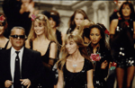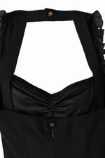 The Fall 1995 Couture collection laid claim to Chanel's synonymity with the LBD (little black dress). The collection contained dresses with similar structures to this dress, noteably the ruched bust, laid-back body skimming fit and the structure of the straps. This ready-to-wear dress takes its lead from the couture silhouettes but was made in a commercial capacity for stores. The Fall 1994 collection contained dresses with ruffle-trimmed straps - seen on Claudia Schiffer as she walked behind Karl Lagerfeld at the end of the show - and could have influenced this design.