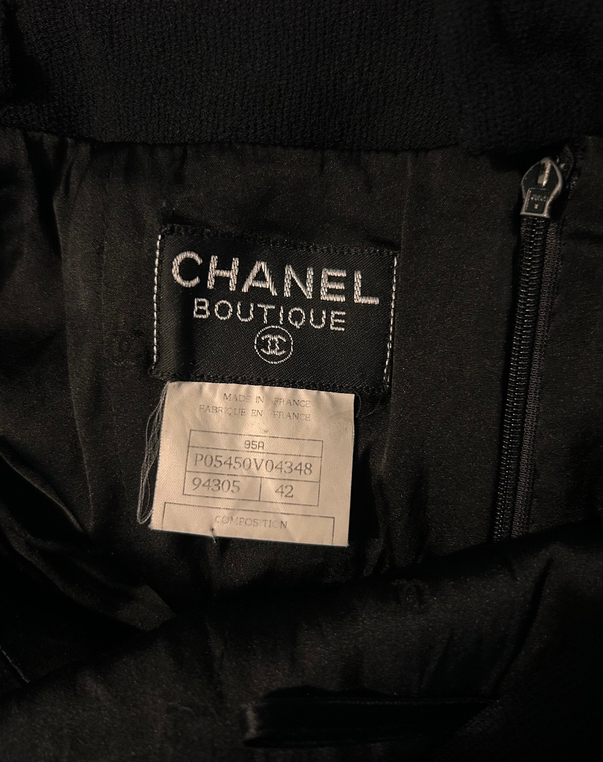 • Chanel Fall 1995 • Textured wool-mix • Sheer silk ruffles • Ruched bust • Cage back • Logo buttons • Made in France