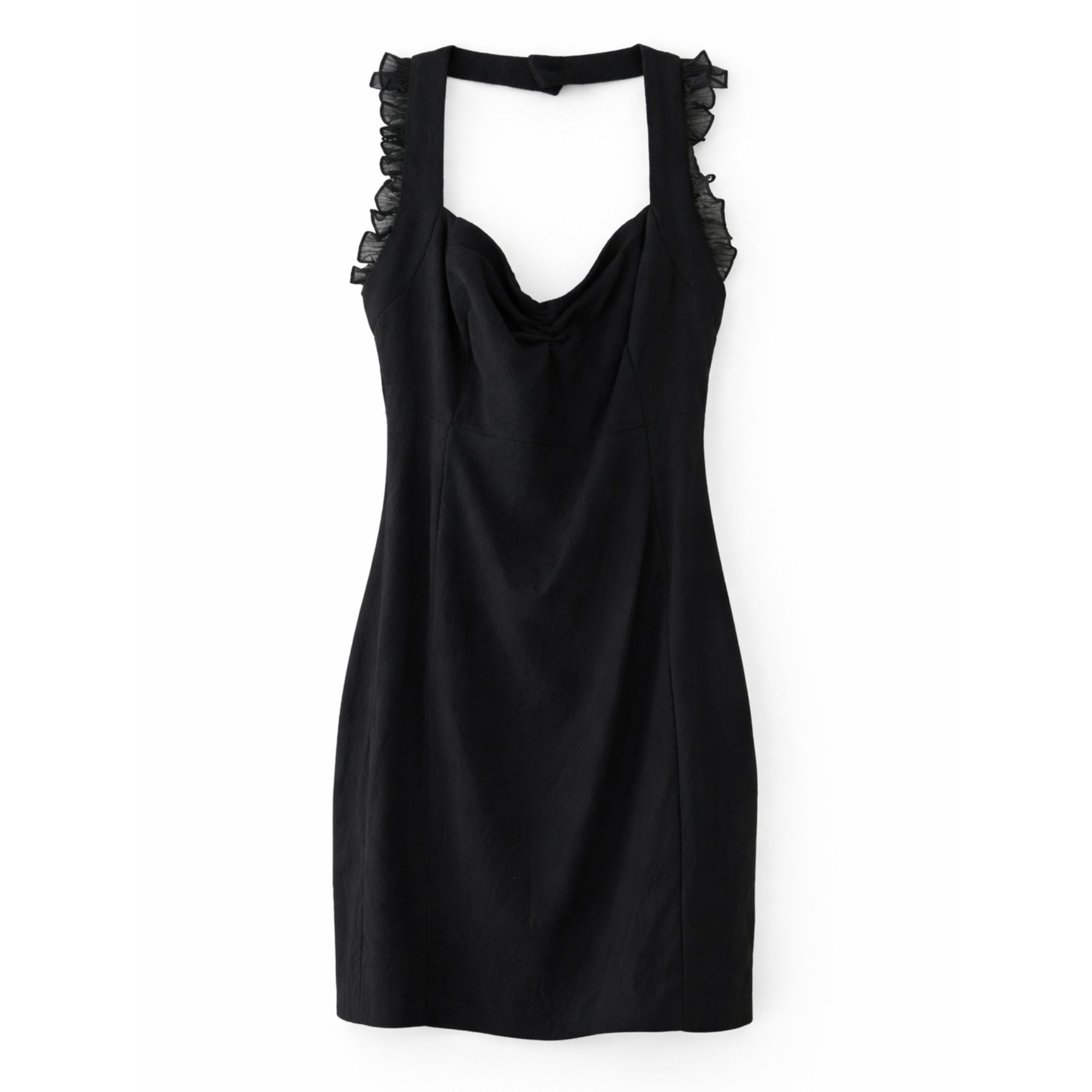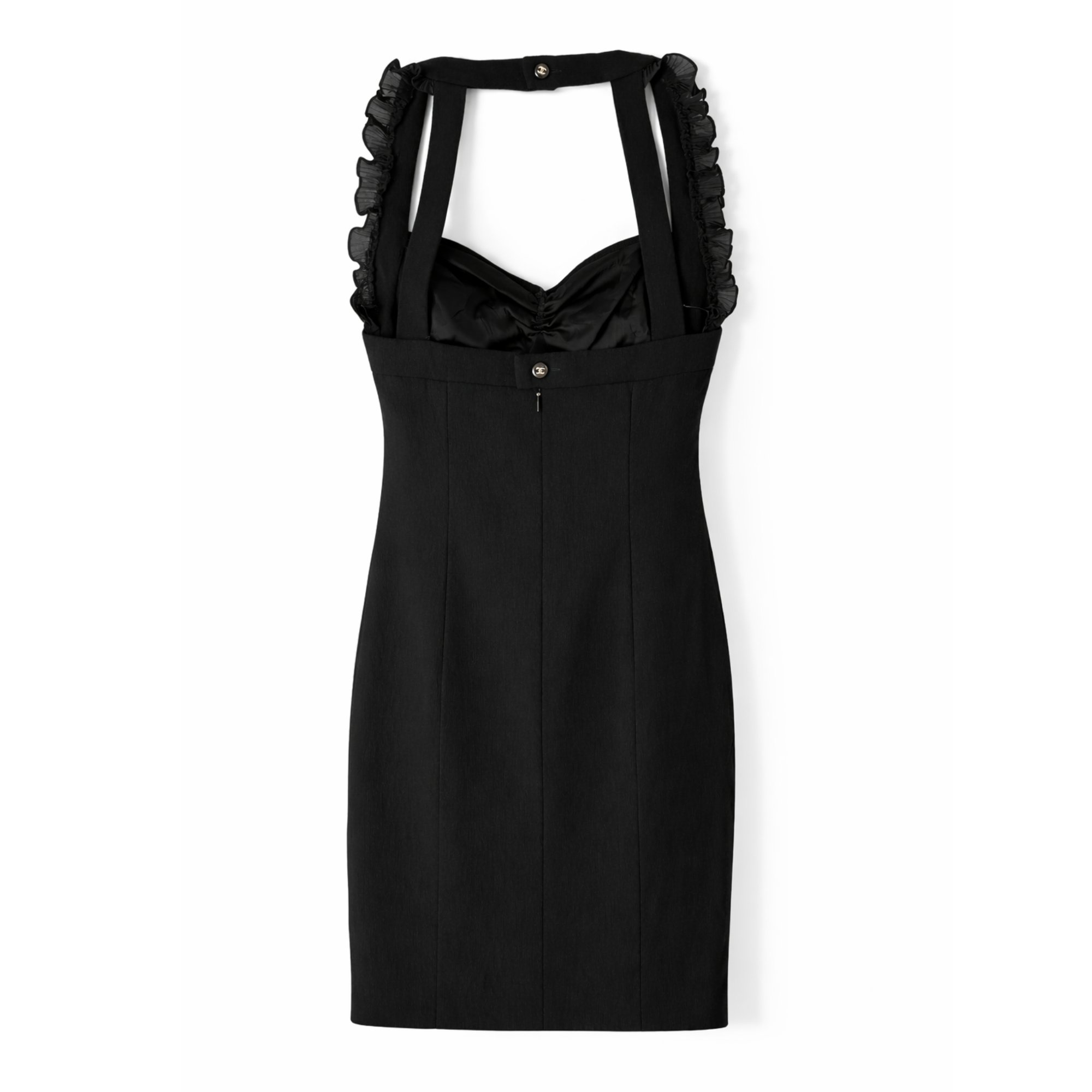 This black ruffle-trimmed dress from Chanel’s Fall 1995 collection exemplifies Karl Lagerfeld’s romantic approach to the house’s heritage. Crafted from a textured wool-blend crepe with softly gathered fabric at the bust, the design flatters the body while maintaining an air of refinement. The straps are detailed with pretty, sheer silk ruffles. The back forms a cage-like structure - a detail that blends structure with seduction - finished with a double-C logo button at the back of the neck. The dress also fastens at the back with a hidden tonal zip and logo button. It is lined with silk woven with the brand's logo. The piece captures the modern, wearable glamour that defined Lagerfeld’s mid-1990s Chanel collections.