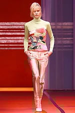 This neon pink and green beaded corset from Christian Lacroix’s Fall 2001 collection embodies the designer’s exuberant approach to couture and his flair for colour, ornament, and theatrical excess. Richly embellished with intricate beadwork, the corset showcases Lacroix’s signature mix of historical reference and haute couture fantasy - merging 18th-century-inspired structure with the bold vibrancy of early-2000s glamour.