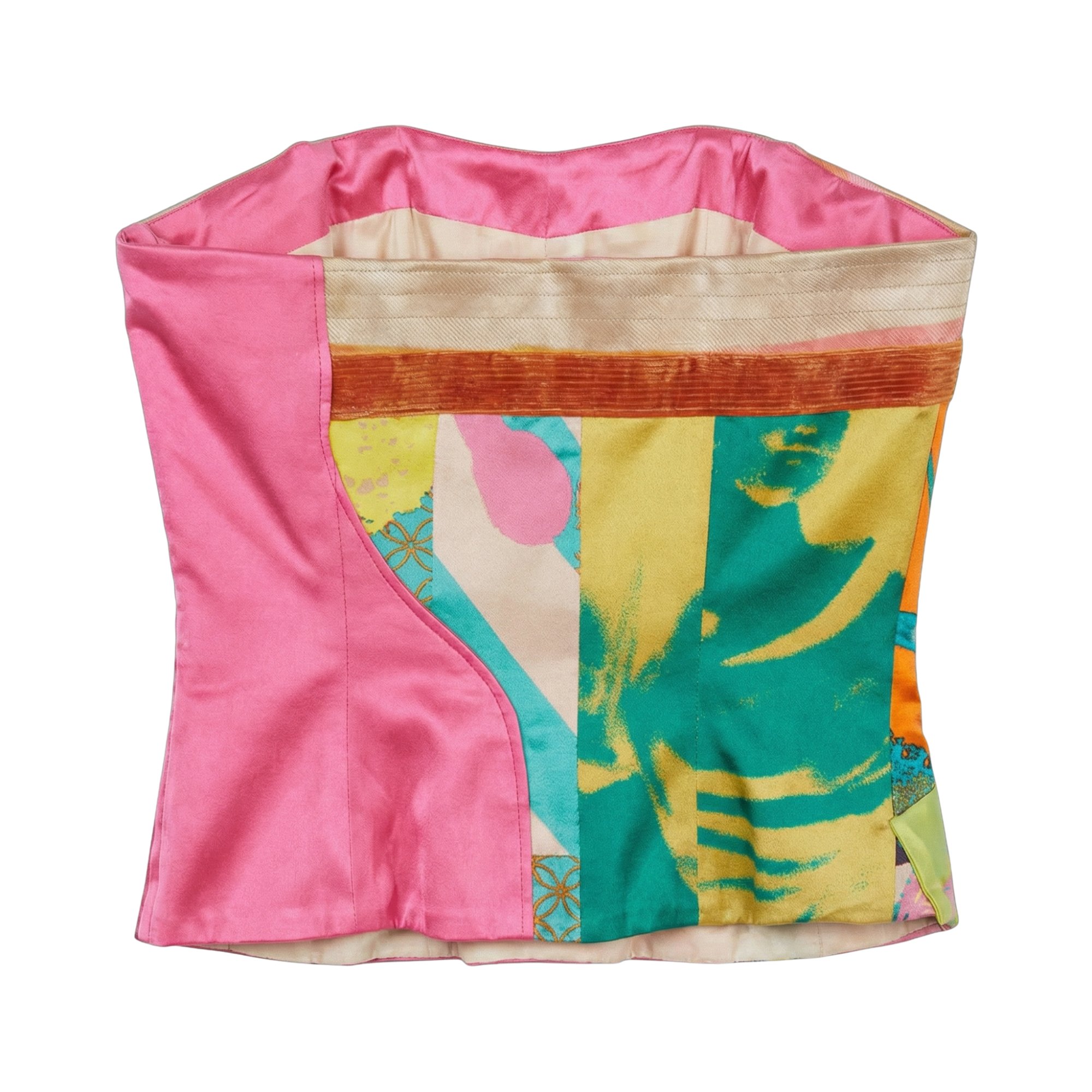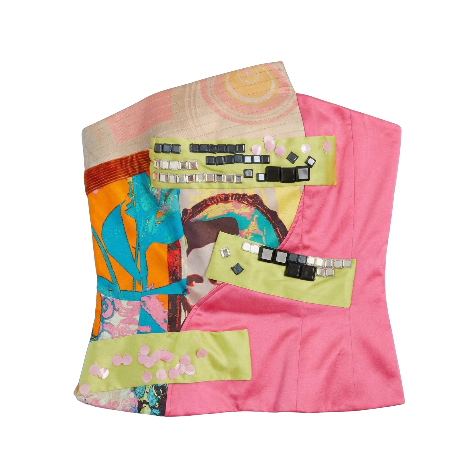 Tailored from an assortment of high quality silk-blend satins in vivid lime green, fuchsia and floral prints, it is embellished with candy pink pailette sequins and square black and silver studs. Varying slightly from the item shown on the catwalk, we believe that no two corsets were created alike, adding to its rariety and collectability. This piece captures the spirit that defined Lacroix’s work at the turn of the millennium: joyfully decorative and rooted in the artistry of couture tradition.