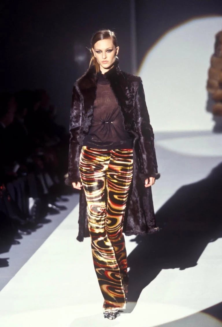 These psychedelic velvet flared trousers from Gucci’s Fall 1999 collection are among the most memorable and sought-after pieces from Tom Ford’s transformative era at the house. Crafted from sumptuous velvet patterned with hypnotic, swirling motifs - the Gucci signature subtly woven into the print - they embody the seductive, high-gloss glamour that defined Ford’s late-1990s aesthetic. The psychedelic velvet was a key theme of the collection, appearing not only in ready-to-wear but also on two handbag styles. Famously worn by Gisele on the September 1999 cover of Vogue and by Carmen Kass for an editorial in the October 1999 edition of French Vogue, these trousers capture the spirit of the moment when Ford redefined modern luxury. Gucci became synonymous with sex appeal, confidence, and cultural impact at the dawn of the new millennium.