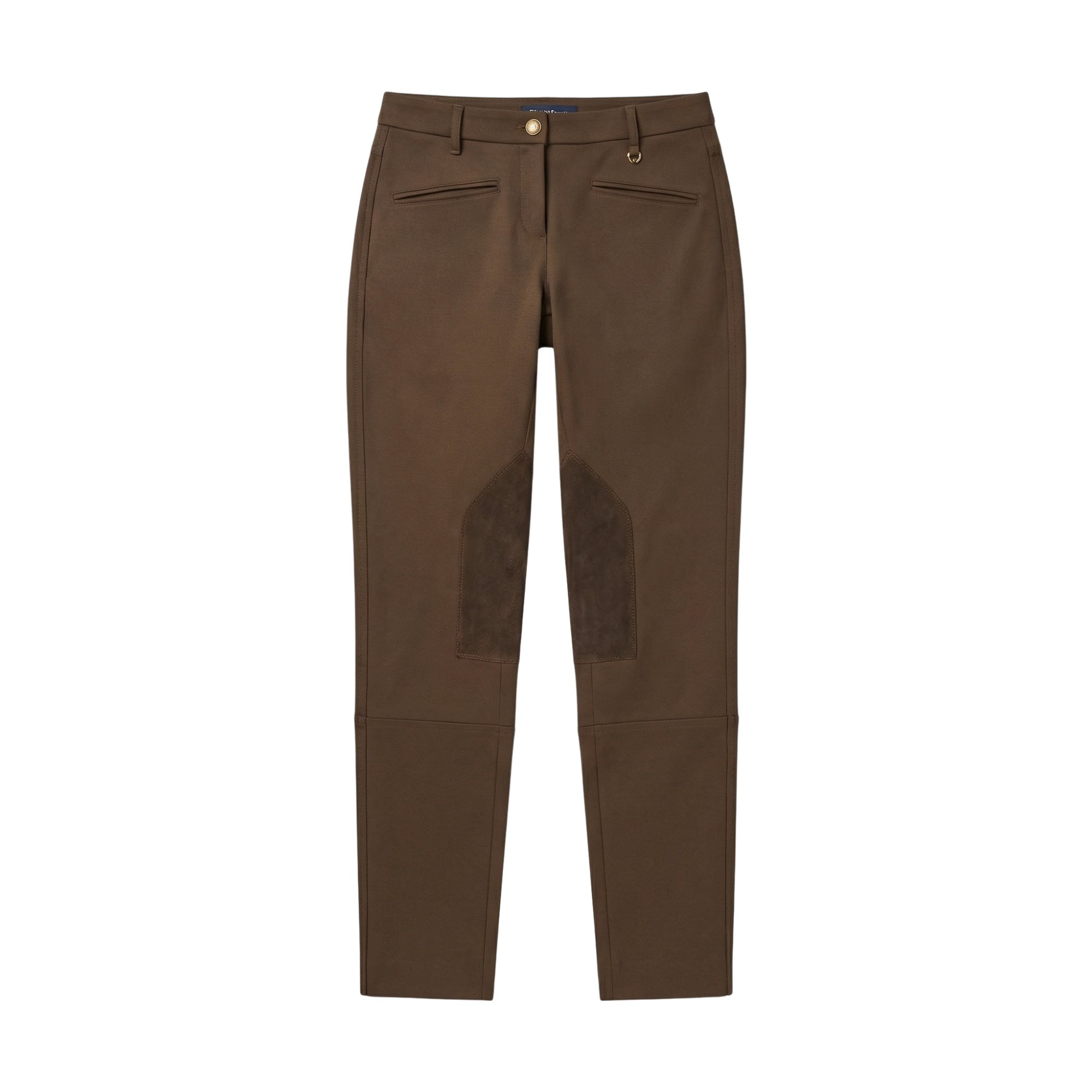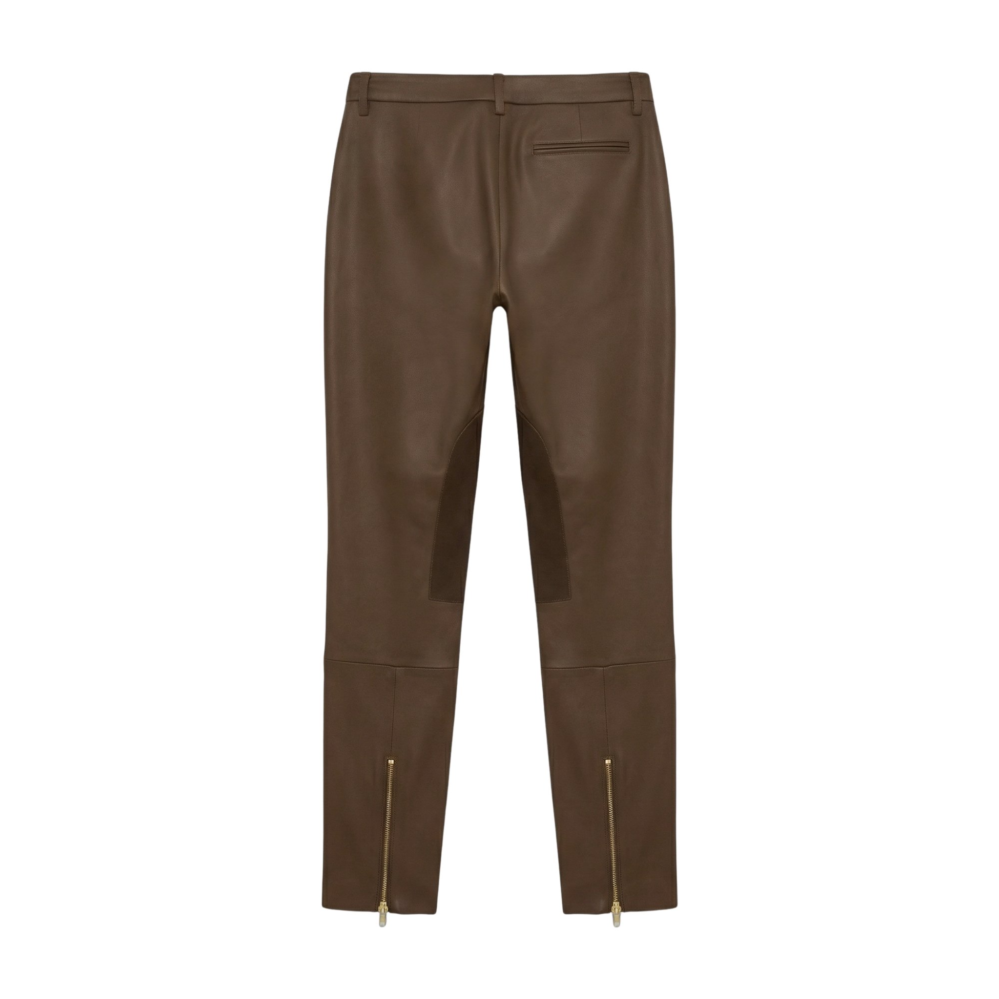Made in Italy, they have a flattering high-waist cut with two welt pockets at the front of the hips and one at the rear. The legs are trimmed with knee pads in darker brown suede. The legs are zipped close at the back of the ankle with logo-embossed gold zips. The fabric has some stretch.