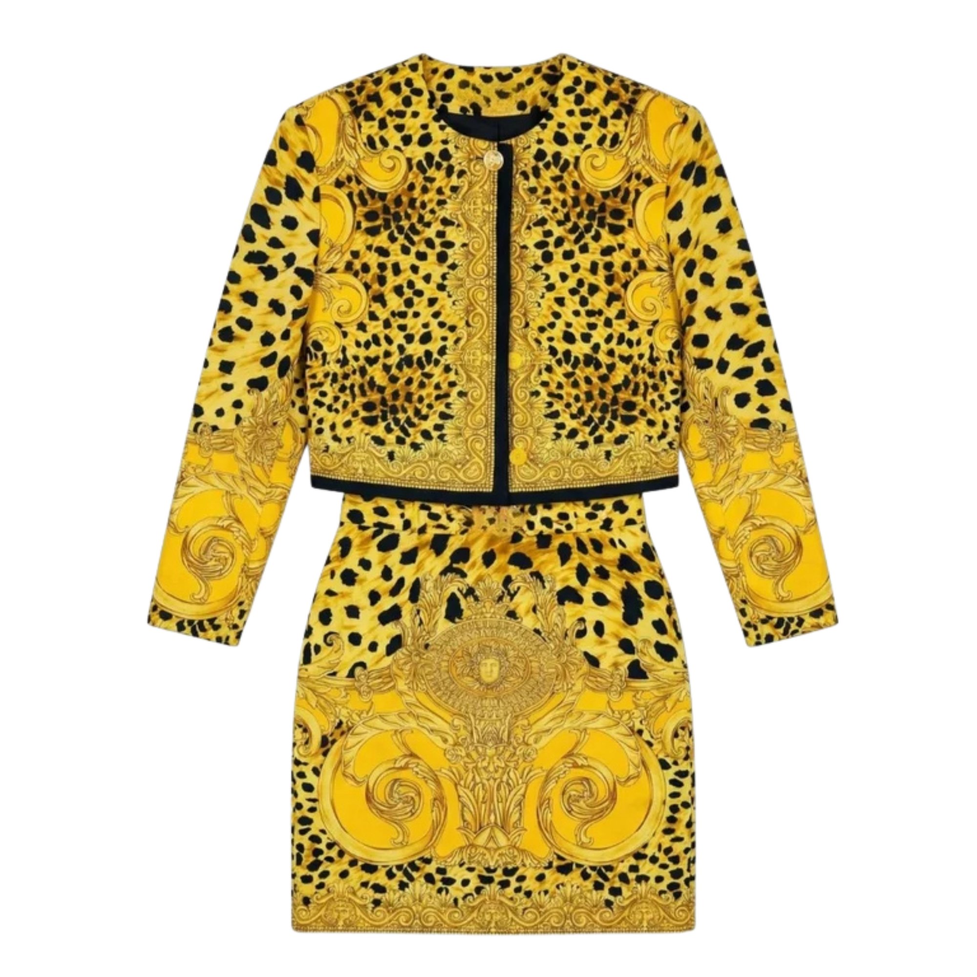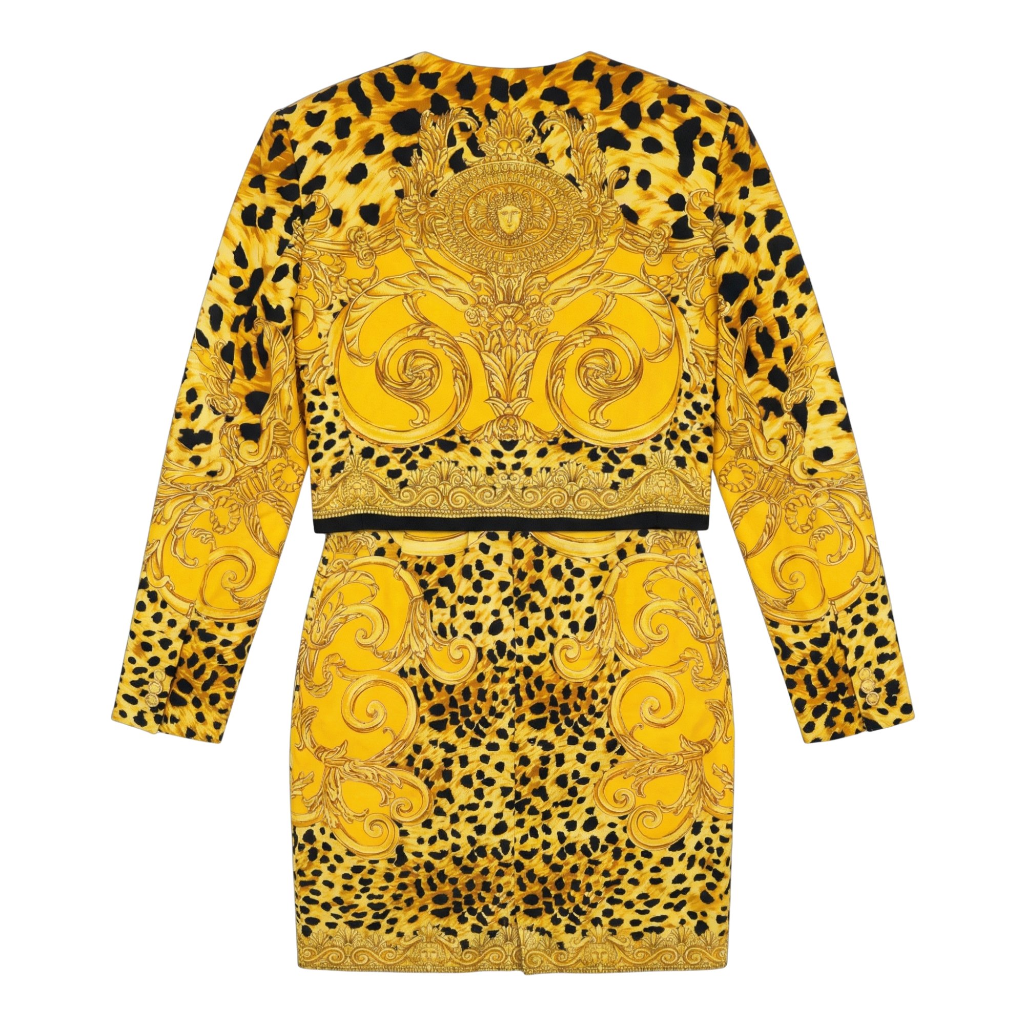 Istante was created by Gianni Versace in 1985 and was designed to bring in a younger, more dynamic clientele without sacrificing the quality Versace was renowned for. Istante formed a sizable part of the Versace company and even had its own dedicated boutiques. This skirt suit and belt ensemble is a highly collectable piece of Versace history and would form a highlight in the wardrobe of a collector of rare Gianni-era Versace. The print is instantly recognisable; opulent baroque flourishes swirled decadently across animal prints and detailed with golden Medusas. This “Barocco” (Italian for baroque) pattern is the most identifiable code of the House of Versace, first introduced as part of Versace's Spring 1992 mainline collection.