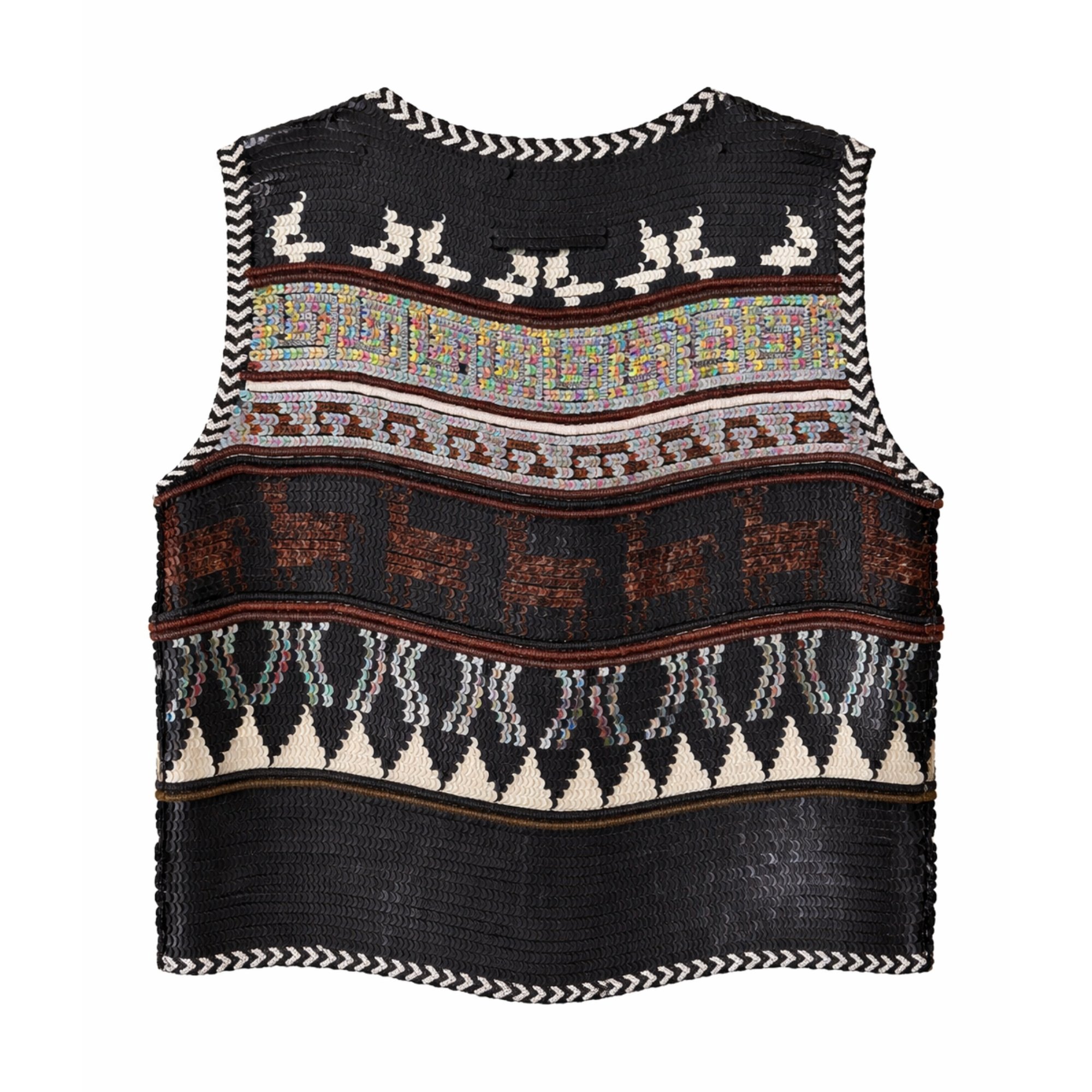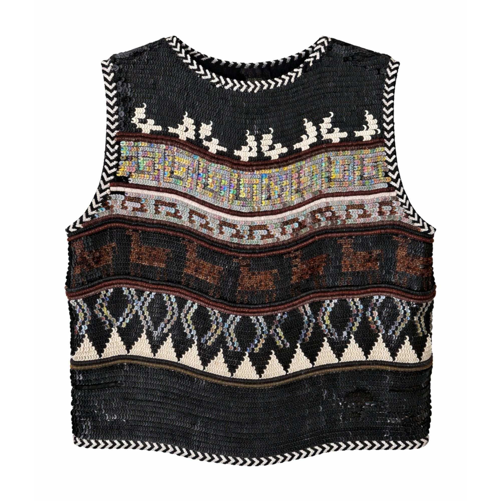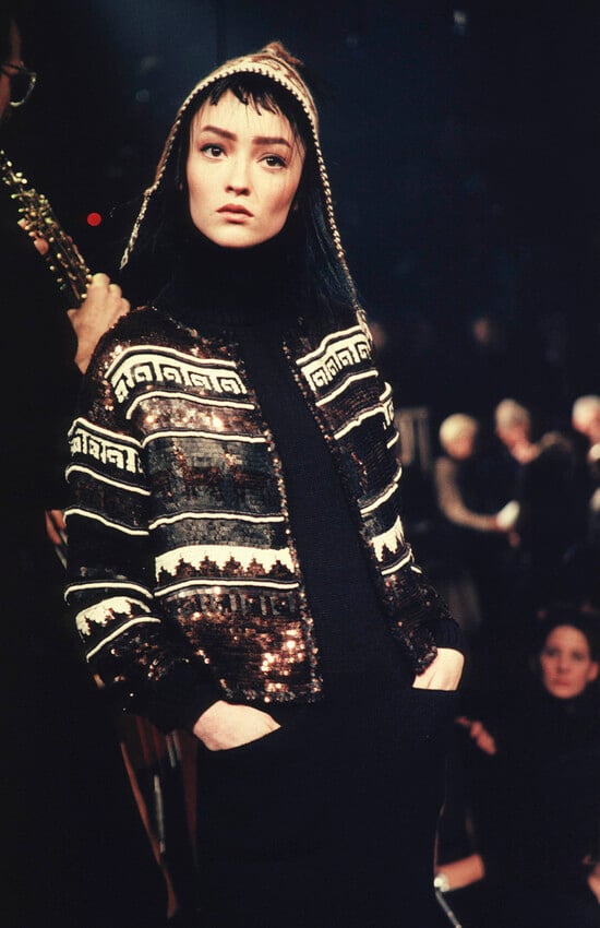 This embellished top is from Jean Paul Gaultier’s Fall 1998 collection. Crafted from a delicate silk crepe to a laid-back, boxy sleeveless silhouette, the piece showcases the kind of painstaking detailing that defined Gaultier’s late-1990s work. It is densely embellished with rows of iridescent sequins and spiralling loops of metal wire to form intricate patterns that recall traditional alpine knits. In the couture collection for this season, Vogue noted that Gaultier used decadent embellishment to create "an Icelandic-style sweater, taking it from a cozy staple to something extraordinary".