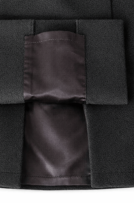 The jacket fastens with a single button at the front, below which it parts to reveal the skirt beneath. The waist is sharply cinched, while the neckline is high, elegant and sculpted. The skirt is high-waisted, fastening at the hip with a concealed tonal zip and hook-and-eye. Below the arrow-shaped stitching, the panel subtly lifts to reveal a concealed flap, emblematic of McQueen’s flirtation with exposure and restraint. This suit stands as a refined example of his ability to fuse historical reference with distinctly modern tailoring. We have not seen the likes of him in British fashion since.