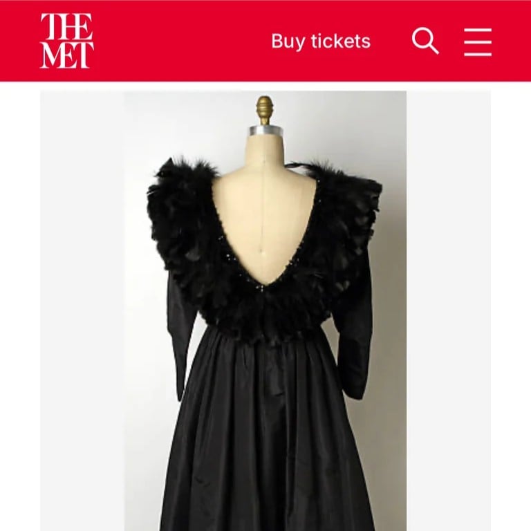 This 1969 Oscar de la Renta black silk taffeta and feather evening dress is an exceptionally rare, early example of the designer’s work. The twin of this dress is preserved in the collection of The Metropolitan Museum of Art, donated by Nina Abrams, a prominent art patron who, with her publishing magnate husband Harry N. Abrams, amassed one of the most important collections of 20th-century art. Their legacy of cultural patronage extended beyond fine art into fashion, making this de la Renta gown a reflection of their enduring support for beauty and craftsmanship.