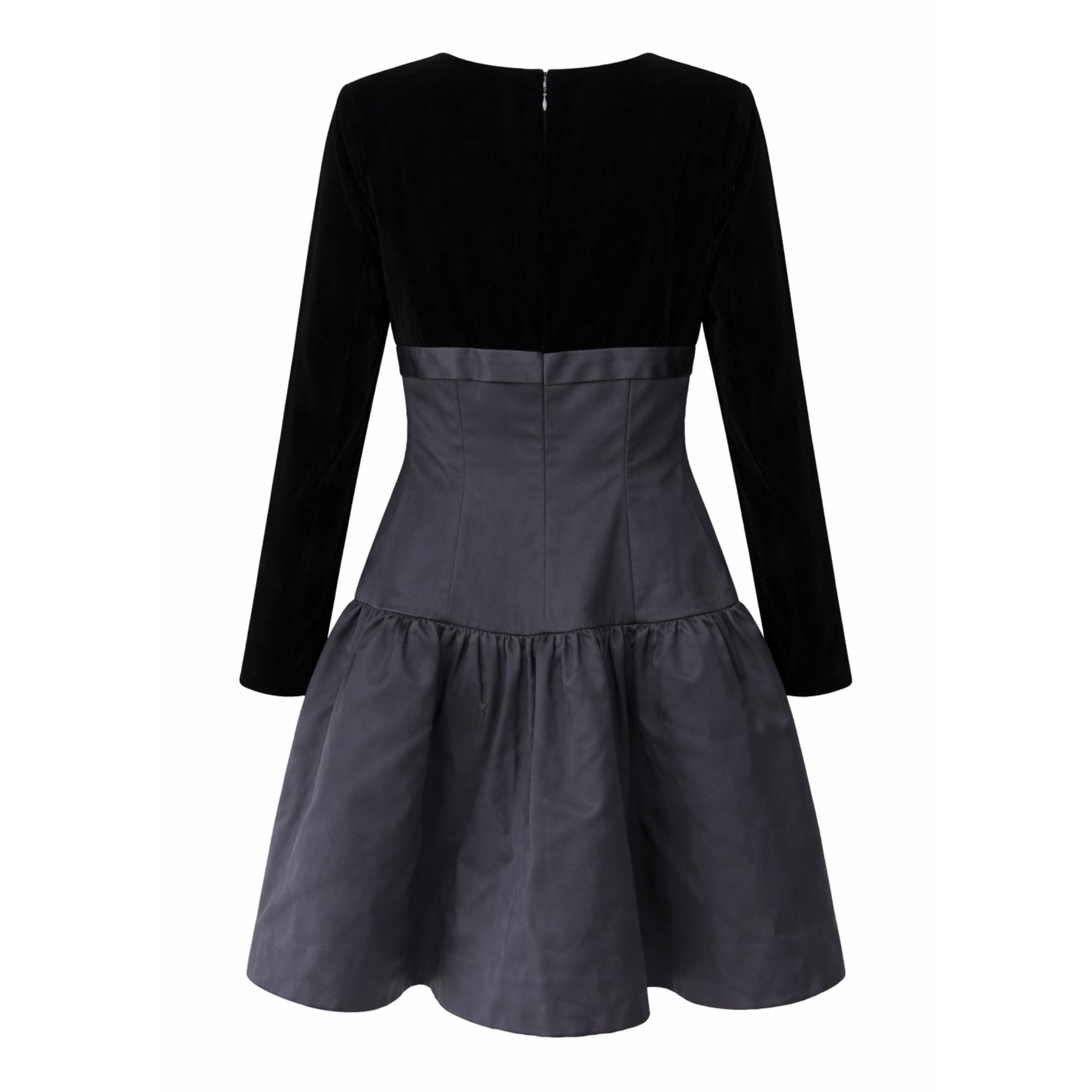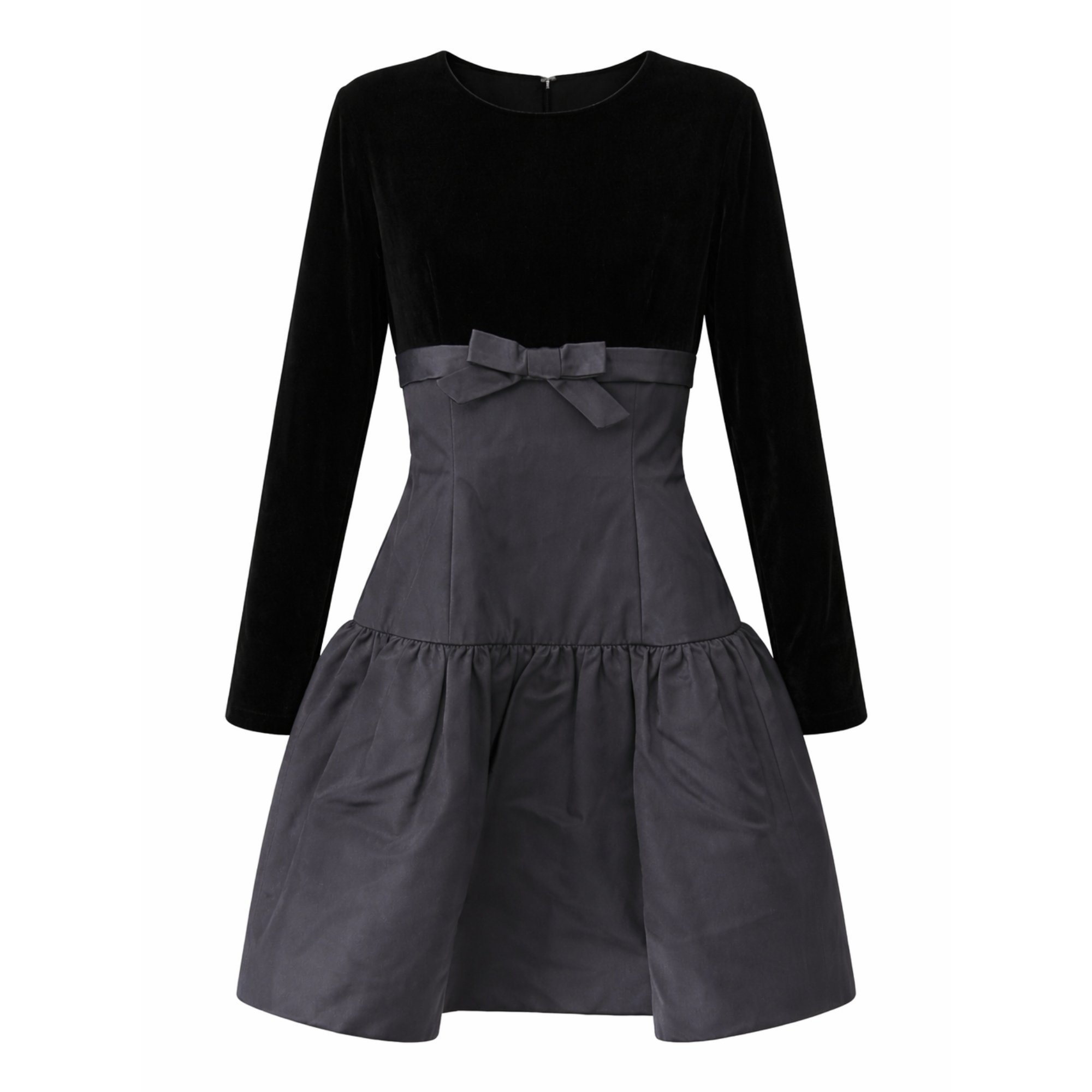 This gown walked the runway as part of Oscar de la Renta's Fall 1992 collection. The designer showed the same silhouette in a variety of colourways, and this dress is crafted from thick black velvet and black silk taffeta. The dress also contains the I. Magnin label, indicating that it was stocked by the San Francisco-based high fashion and luxury goods department store. The bust and sleeves are tailored from thick black cotton velvet. The bust is detailed with a band of satin and a flat bow at the centre front. Below the bust, the dress is crafted from satin and panelled like a corset to cinch the waist. It then gives way to a voluminous skirt with a stiff, structured bottom hem, further lined with black tulle and a black satin slip. This creates a sculpted drop-waist silhouette that could be designed in the present day. The dress fastens at the back with a hidden tonal zip. and hook-and-eye.