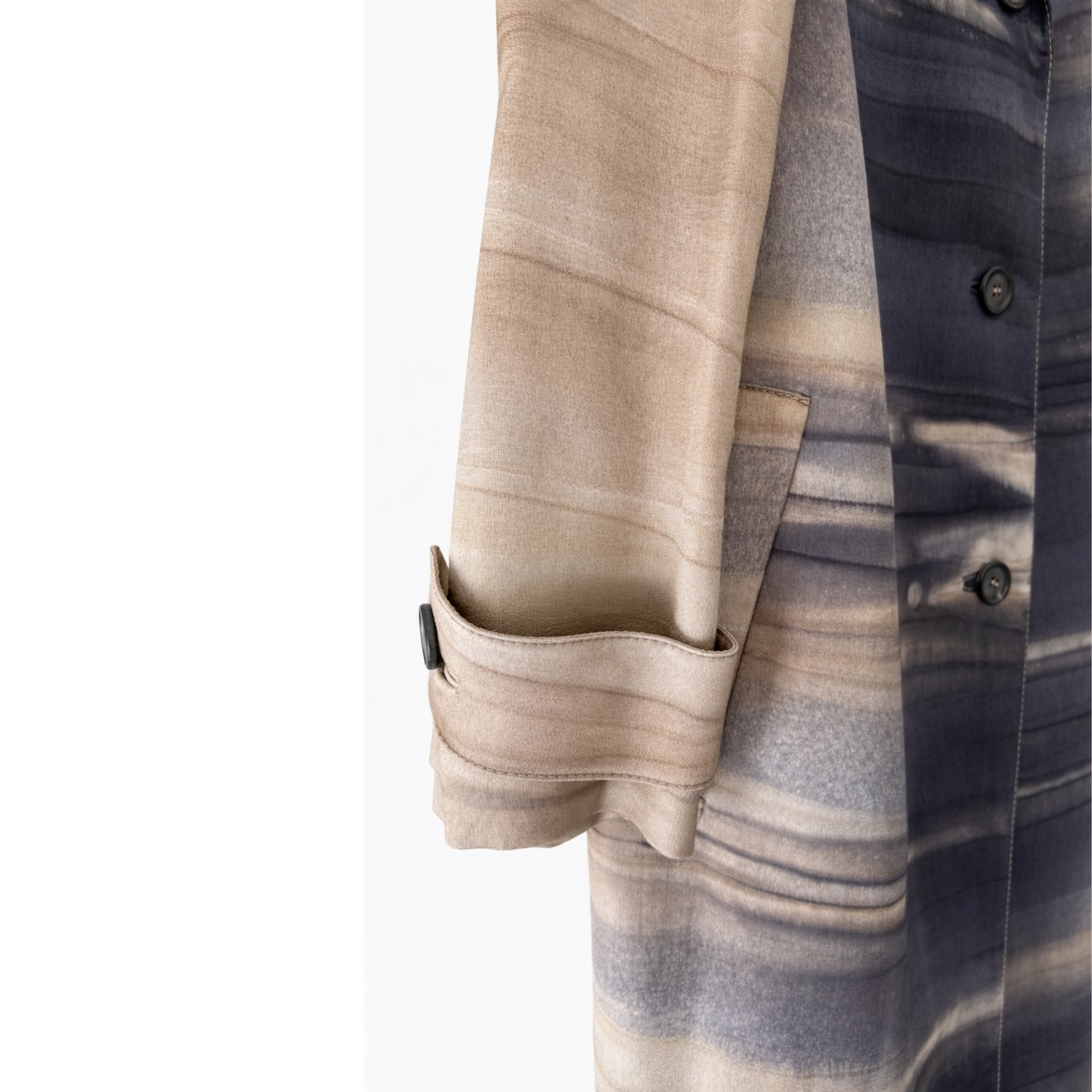Distinctive tie-dye fabric appeared throughout the collection, setting the tone for a show that blended ancient artistry with digital-age experimentation. As Vogue noted, the fabric became “a perfect conflation of old-world luxury with classic Prada techno fabric that stood as the symbol of the entire collection.” Influenced by the romantic landscapes of Caspar David Friedrich, the collection merged the painterly and the programmed. This rare ensemble - featuring a unique, one-off tie-dye variation - exemplifies Prada’s ability to turn fabric into a philosophical statement. Prada herself described the collection as “a dream of extreme romanticism - the idea of 18-century painting, with video games. A romanticism between past and future.”