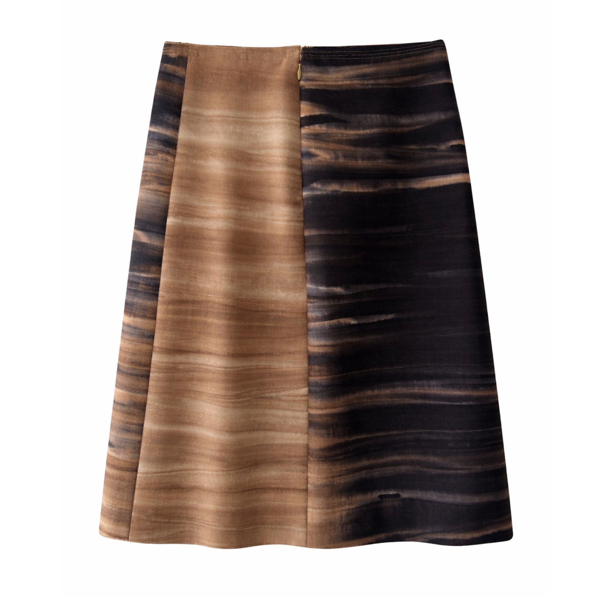 This coffee-brown and navy, wool-silk coat has a slight sheen to the fabric and is tailored to a classic overcoat style with wide lapels and a cocooning, straight-cut body. The sleeves are finished with button-adorned sleeve loops, and the back has a martingale half-belt in coordinating fabric. The rear of the coat has a vent. The inside of the collar is decadently finished with grey mink, but this collar lining can be removed as the wearer desires. There are welt pockets at the hips. The skirt is cut to a high-waist fit and has an A-line silhouette. It fastens at the centre back with a tonal zip. Both piece are lined with coffee-brown satin.