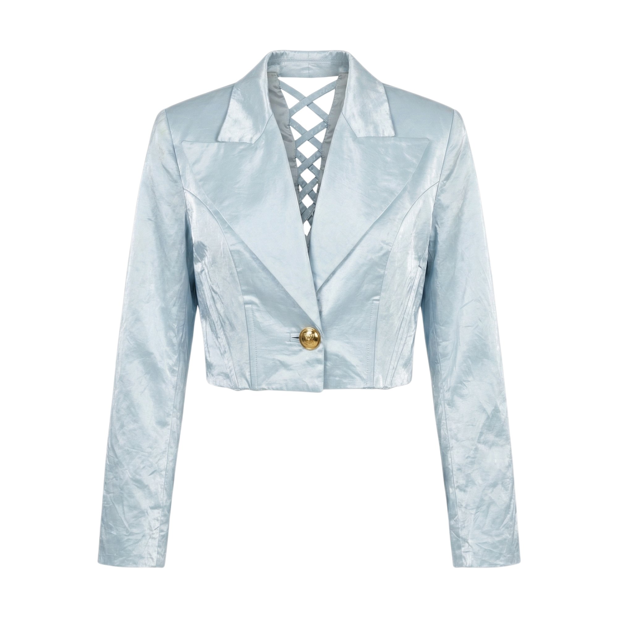 This baby blue satin skirt suit was designed by Gianni Versace for his Versus line during the early ‘90s. We believe this suit was designed as part of the Spring 1995 collection, where models - including Kate Moss and Amber Valetta - walked the runway in a variety of wide-lapelled satin suits. The jacket is cut to a cropped-length and detailed with gold buttons engraved with leopards. The back of the jacket has unusual, eye-catching detailing in the form of criss-crossing strips of satin that create a lace-up effect and reveal flashes of skin. The jacket is boned all the way around for a corset-style shaping of the body. The skirt is tailored to a super mini-length - a signature of the Versace brand at the time and very similar to the pastel mini-skirts worn in the iconic Fall 1994 advertising campaign shot by Richard Avelon. It fastens at the back with a hidden tonal zip. Both pieces are fully lined in pale blue satin.